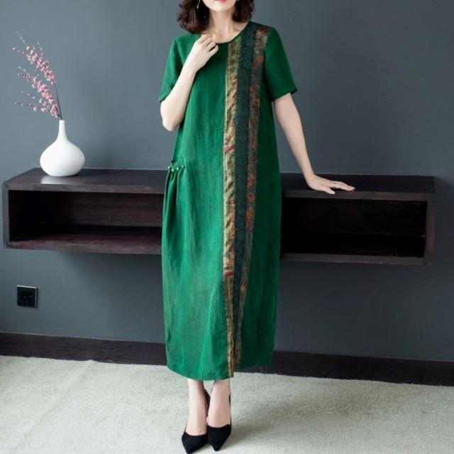 《入荷待ち》全2色 大きいサイズ 和柄 切替 ワンピース フレアワンピ Aライン 半袖 ラウンドネック ロング丈 マキシ丈 綿 麻 エスニック ゆったり マタニティ 体型カバー レトロ カジュアル ナチュラル 春 夏 かわ大 キレナチュ
