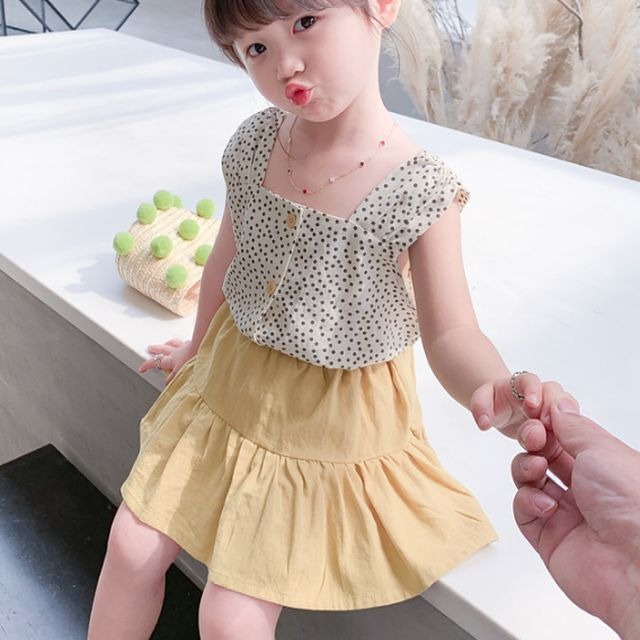 《入荷待ち》 ノースリーブシャツ フレアスカート ツーピースセット ドット柄シャツ スクエアネック ミニ丈スカート おめかし スクエアバック キッズ 女の子 春 夏 秋 普段着 お出かけ 公園 キッズウェア