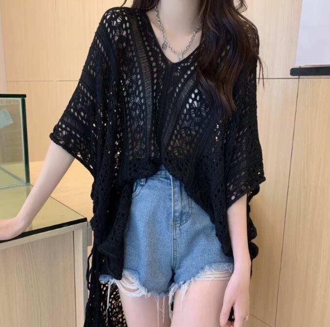 透かし編み ニットチュニック カーディガン レディース カバーアップ 水着 羽織り 夏 涼しい ゆったり 体型カバー おしゃれ 五分袖 フリーサイズ 全4色