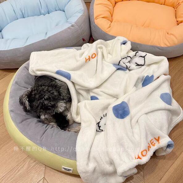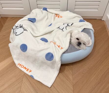 可愛いイラスト入りのペット用ブランケットです。ふわふわの肌触りで暖かく、寒い季節の防寒対策にぴったり。軽量で扱いやすく、洗濯機で丸洗い可能なので、いつでも清潔にお使いいただけます。