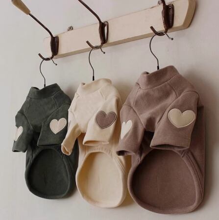 袖にハートのワンポイントがついた、シンプルでかわいい犬用長袖トレーナー。落ち着いたアースカラーで、インテリアにも馴染みやすく、毎日のお散歩やお出かけにぴったりです。