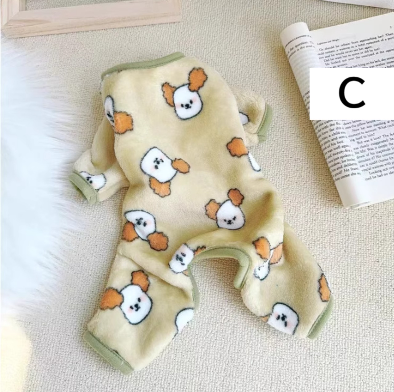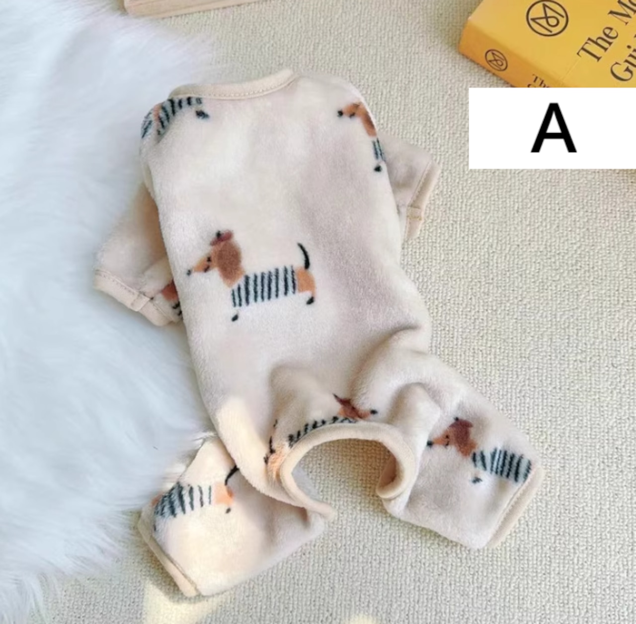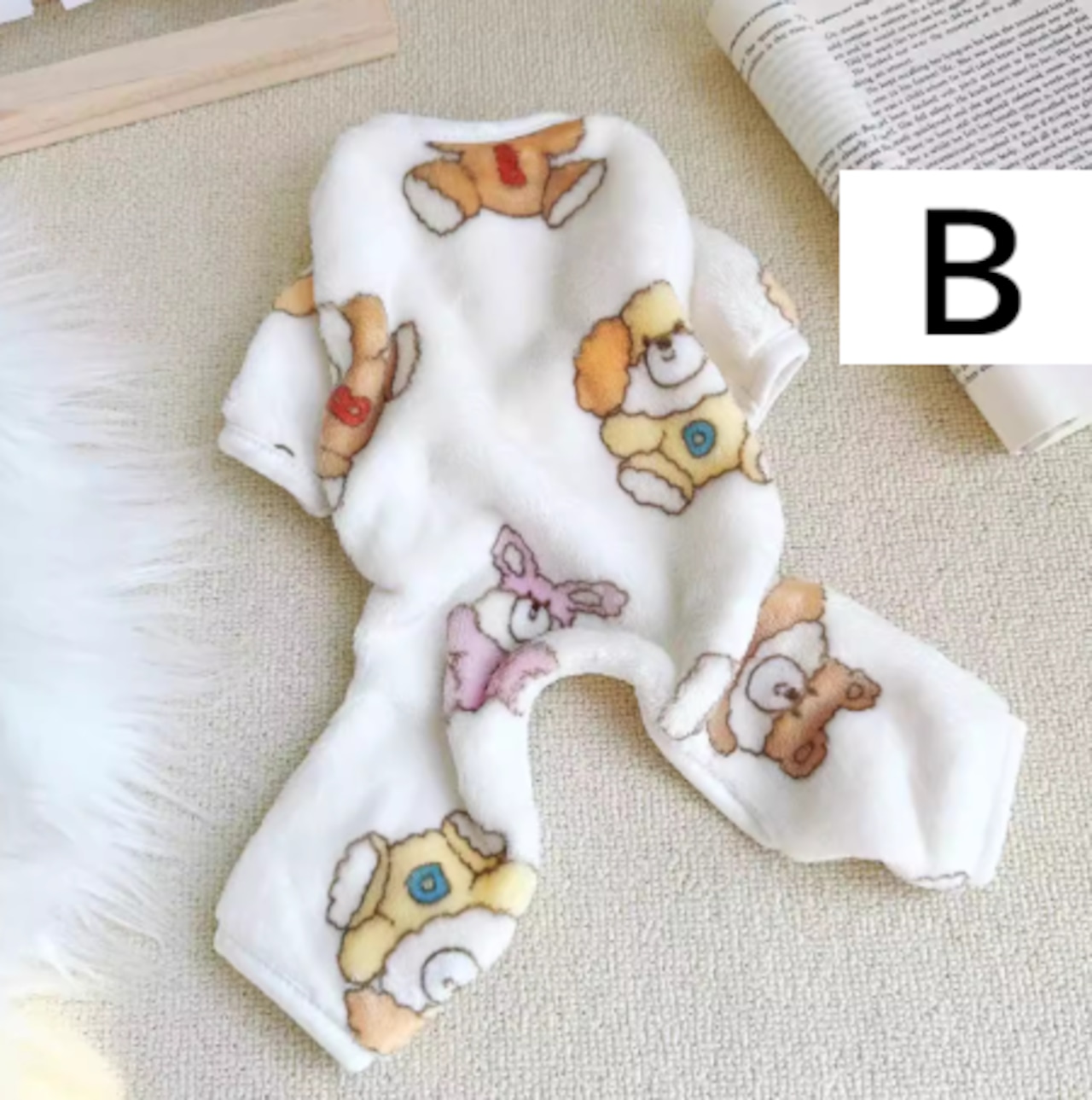 寒い季節にぴったりの柔らかフリース生地を使用した、ワンちゃん用つなぎ(ロンパース)。ふんわり軽い着心地で、冬のお部屋着や就寝時のパジャマに最適です。
