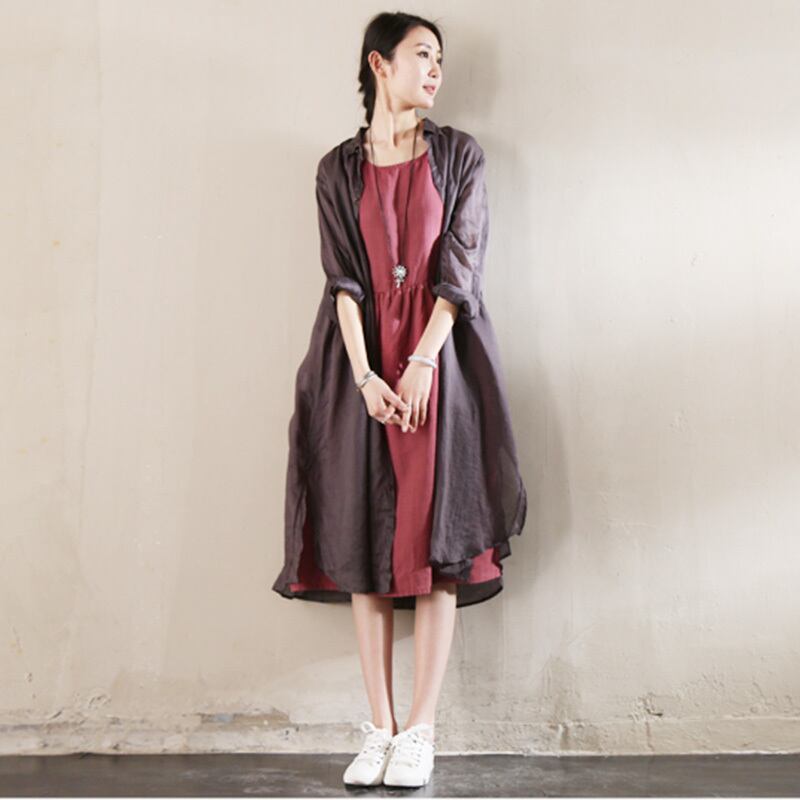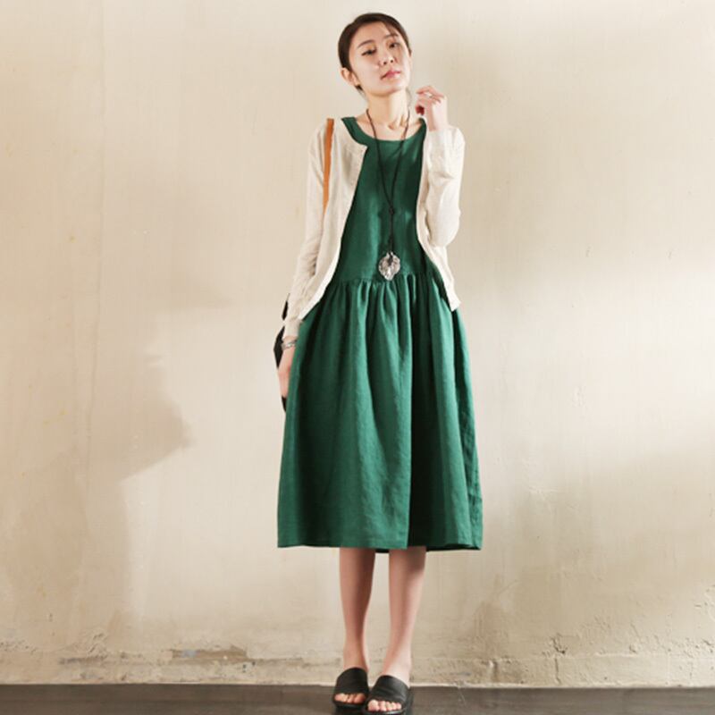 《入荷待ち》ワンピース ラウンドネック ノースリーブ ウエスト切り替え ミディ丈 ミモレ丈 フレアスカート レッド グリーン ナチュラル お出かけ レトロ リネン