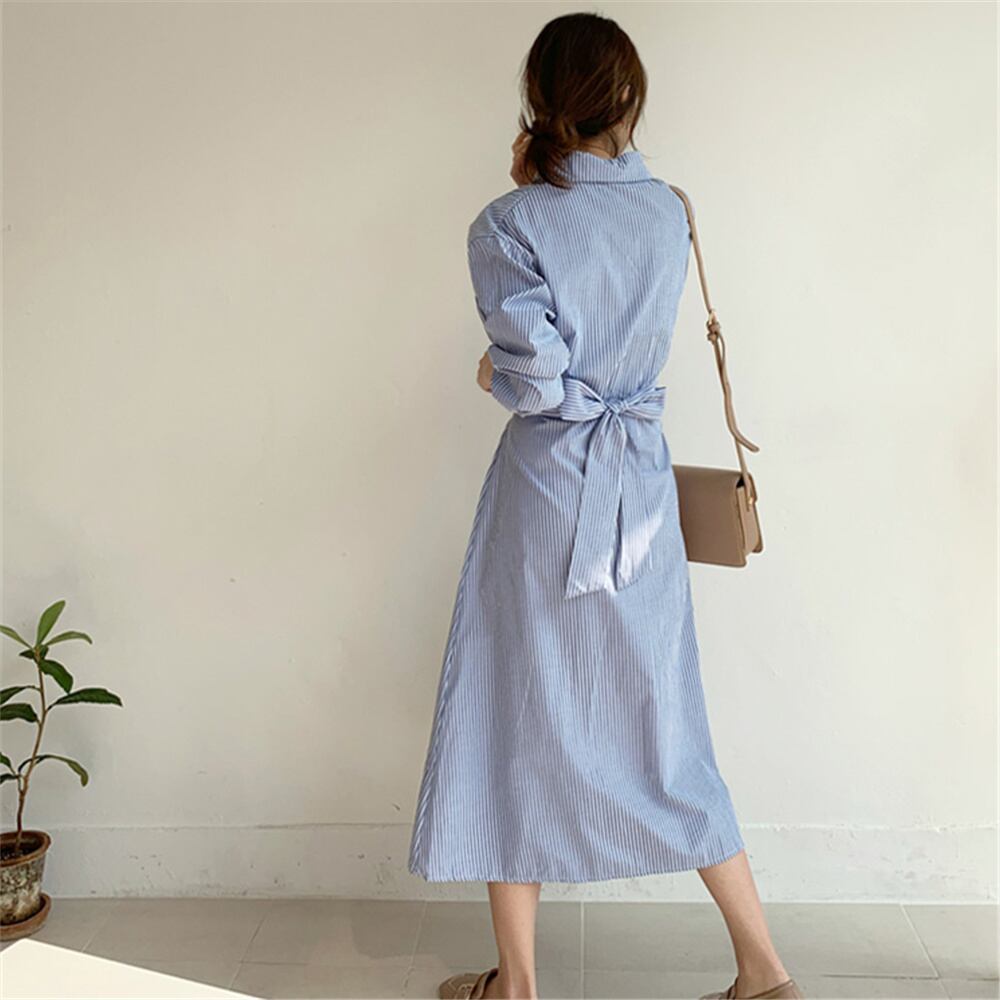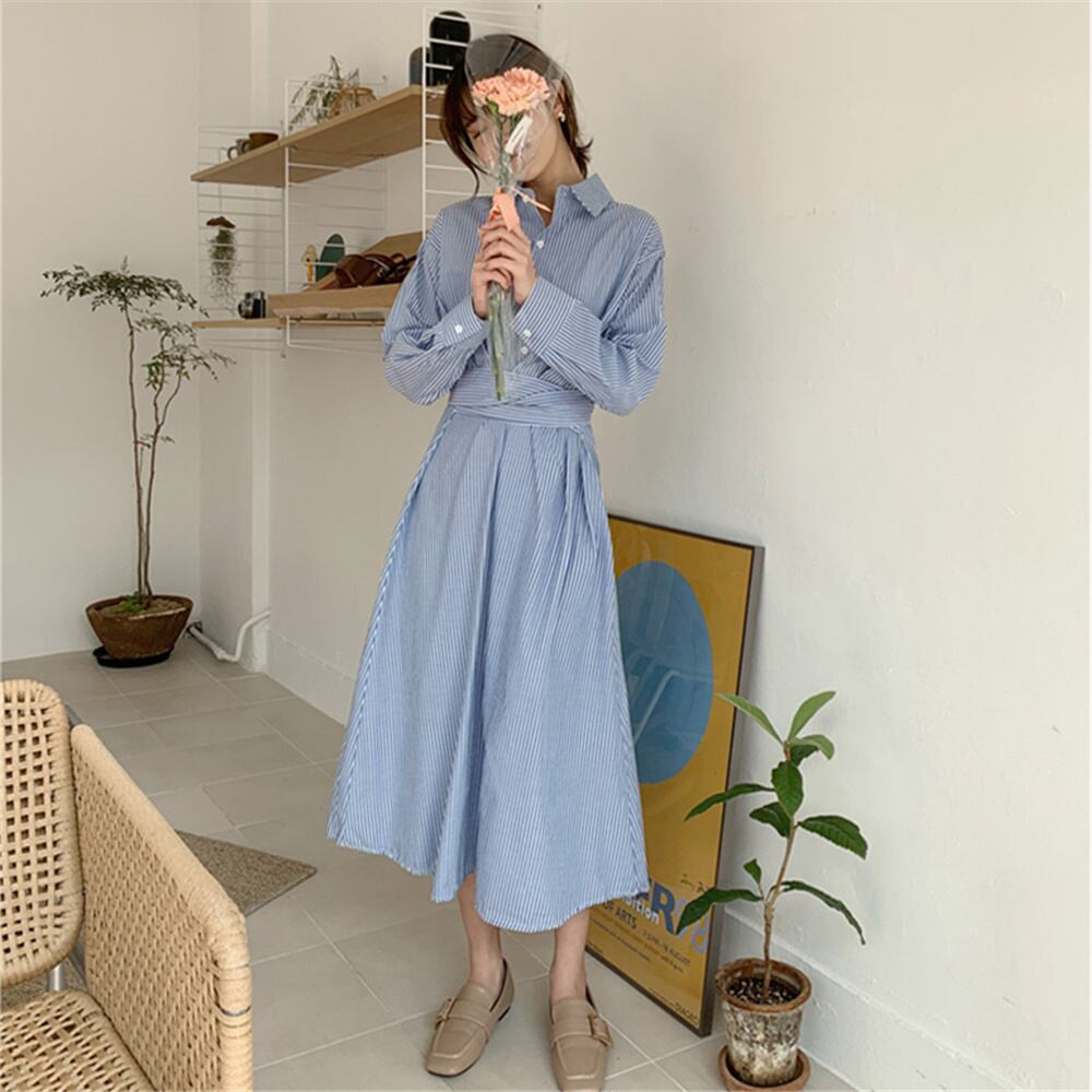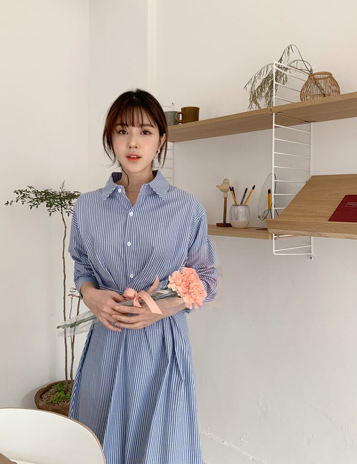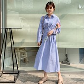 《入荷待ち》ストライプ シャツワンピ ウエストマーク ハイウエスト ロング丈 長袖 ワンピース ブルー バックリボン 爽やか デート お出かけ 女子会