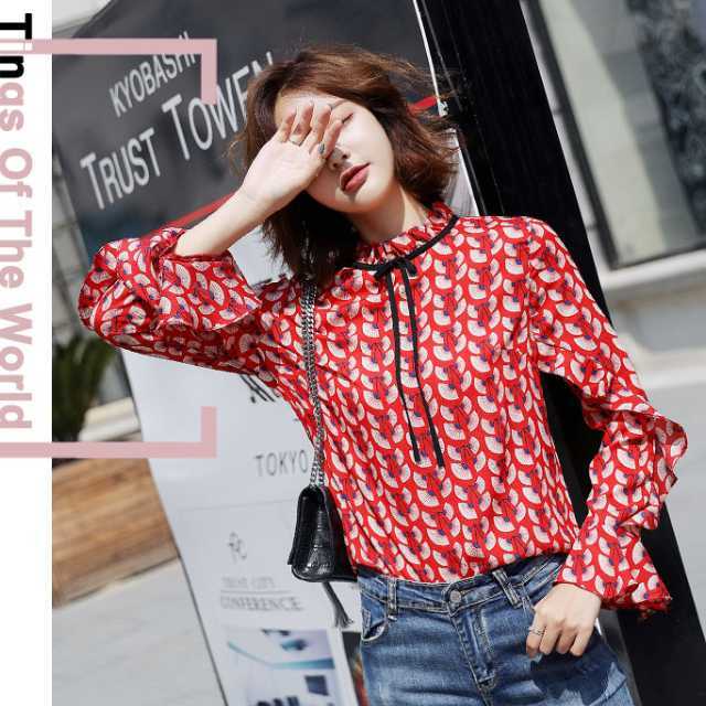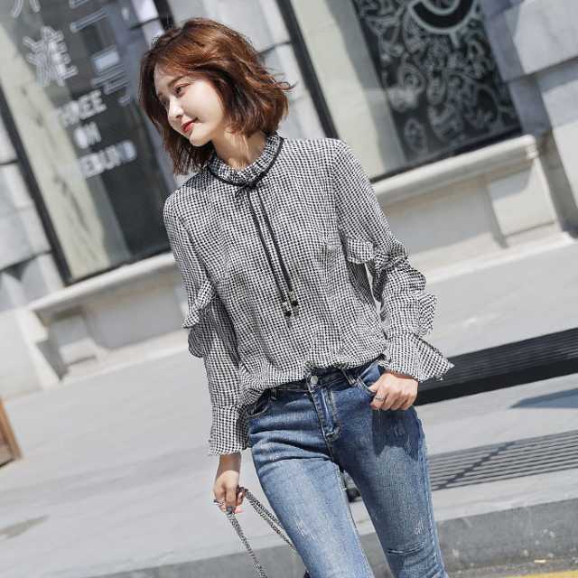 《入荷待ち》レトロ シフォンブラウス ハイネック リボン 袖コン 袖コンシャス ボリューミー袖 ベルスリーブ 千鳥格子 女子会 お出かけ デート