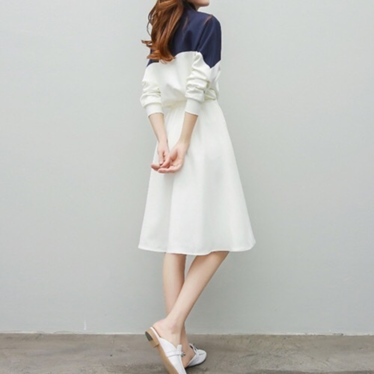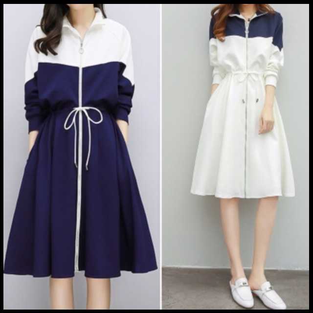 人気商品 即納 在庫限り 特価 プチプラ 限定 ワンピース 大きいサイズ ウエストマーク ハイウエスト フルジップ スポーティー フレアスカート バイカラー 膝丈 長袖 ツートーン