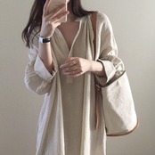 ワンピース ボリューム袖 Vネック バルーンスリーブ マキシ丈 長袖 ホワイト オーバーサイズ ゆったり こなれ感 楽ちん ナチュラル スリット シンプル コットン