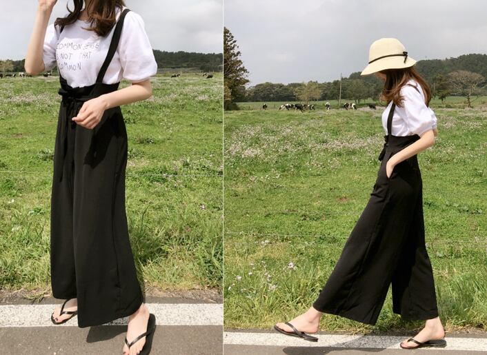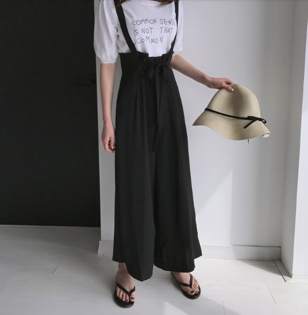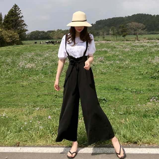 《入荷待ち》サロペット オールインワン パンツ シンプル ワイドパンツ ハイウエスト ブラック リボン 楽ちん お出かけ デート 女子会 春 夏 大人可愛い