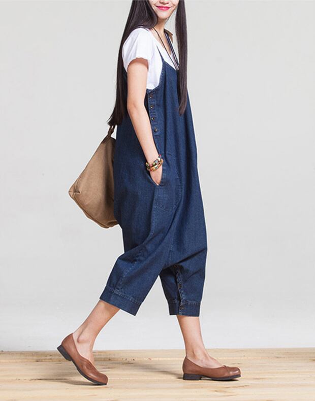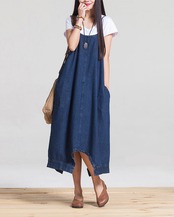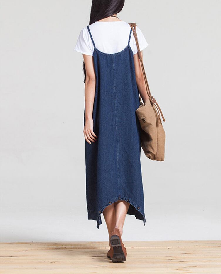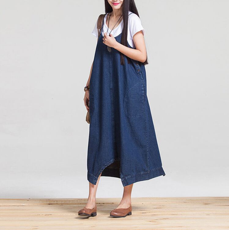 《入荷待ち》デニム オールインワン サロペット ワンピース 2way サイドボタン カジュアル 大人可愛い 楽ちん ゆったり ロング丈 スカート パンツ インディゴブルー