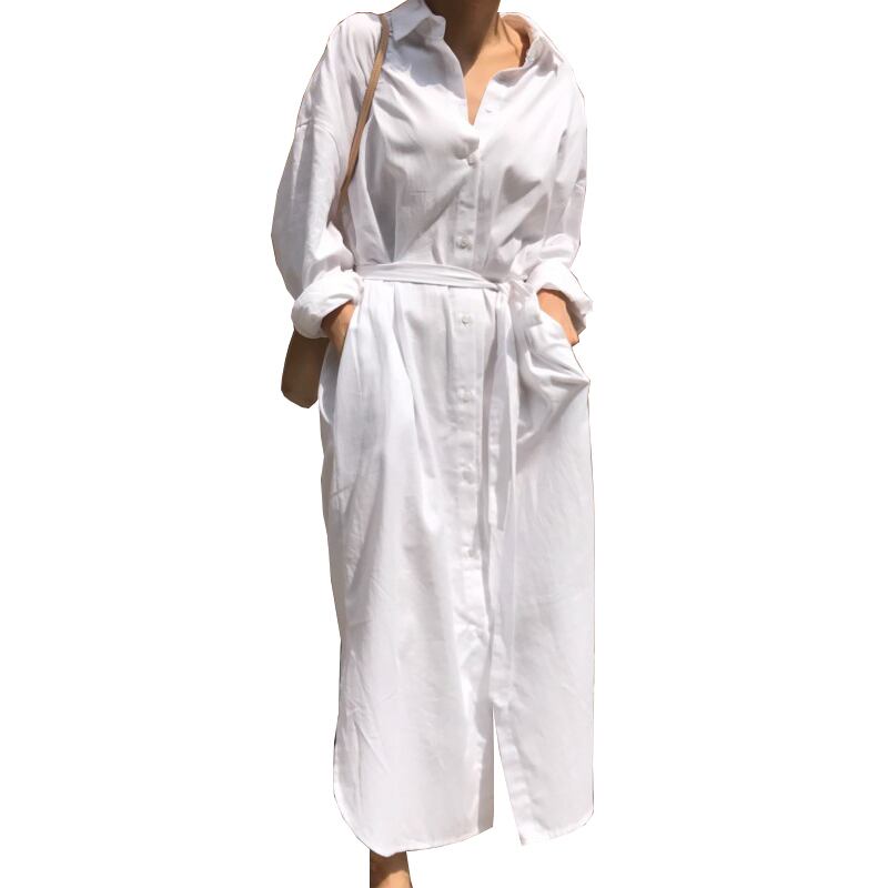 シャツワンピース こなれ感 ホワイト 大人女子 キレイめ 長袖 ハイウエスト リボン Vネック