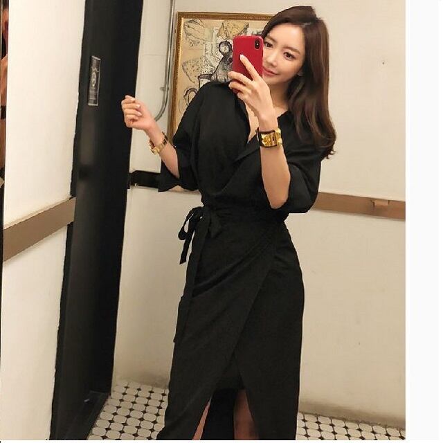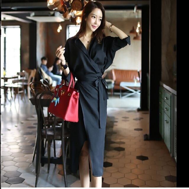 即納 数量限定 在庫あるだけ セール 超特価 シャツワンピース カシュクール Vネック 七分袖 ウエストリボン ハイウエスト スリット ミディ丈 ミモレ丈 オケージョン