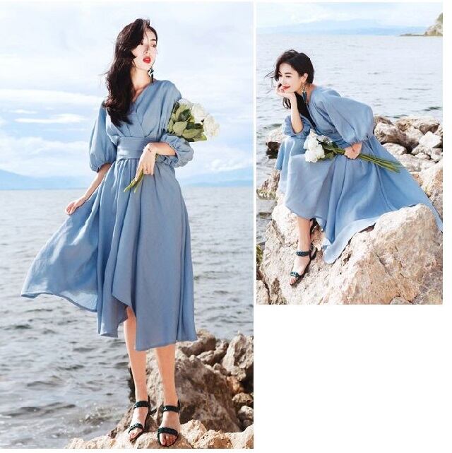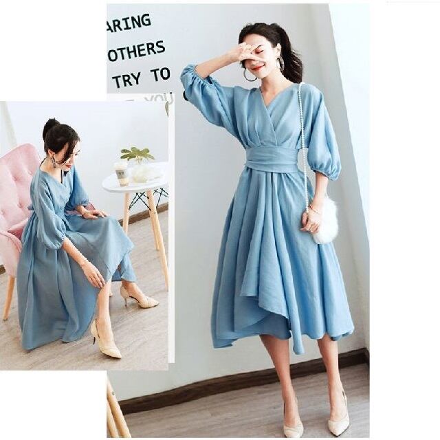 《再入荷》ロングワンピース Vネック カシュクール ランタンスリーブ ハイウエスト ミモレ丈 お出掛け デート