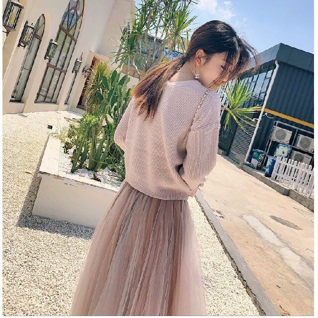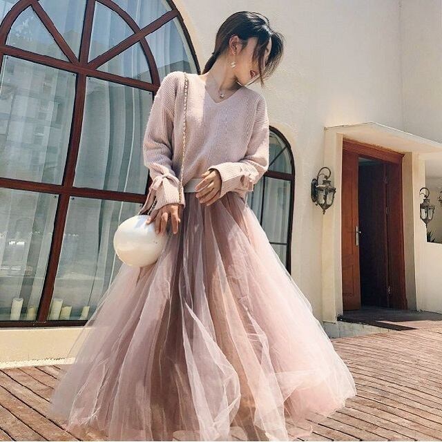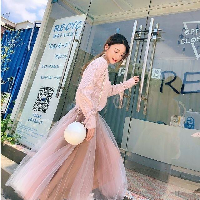 《再入荷》セットアップ ツーピース ニット チュールスカート 長袖 リボン ミディ丈 ミモレ丈 お出かけ デート