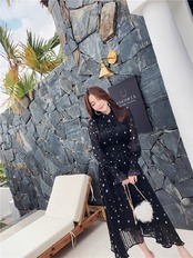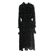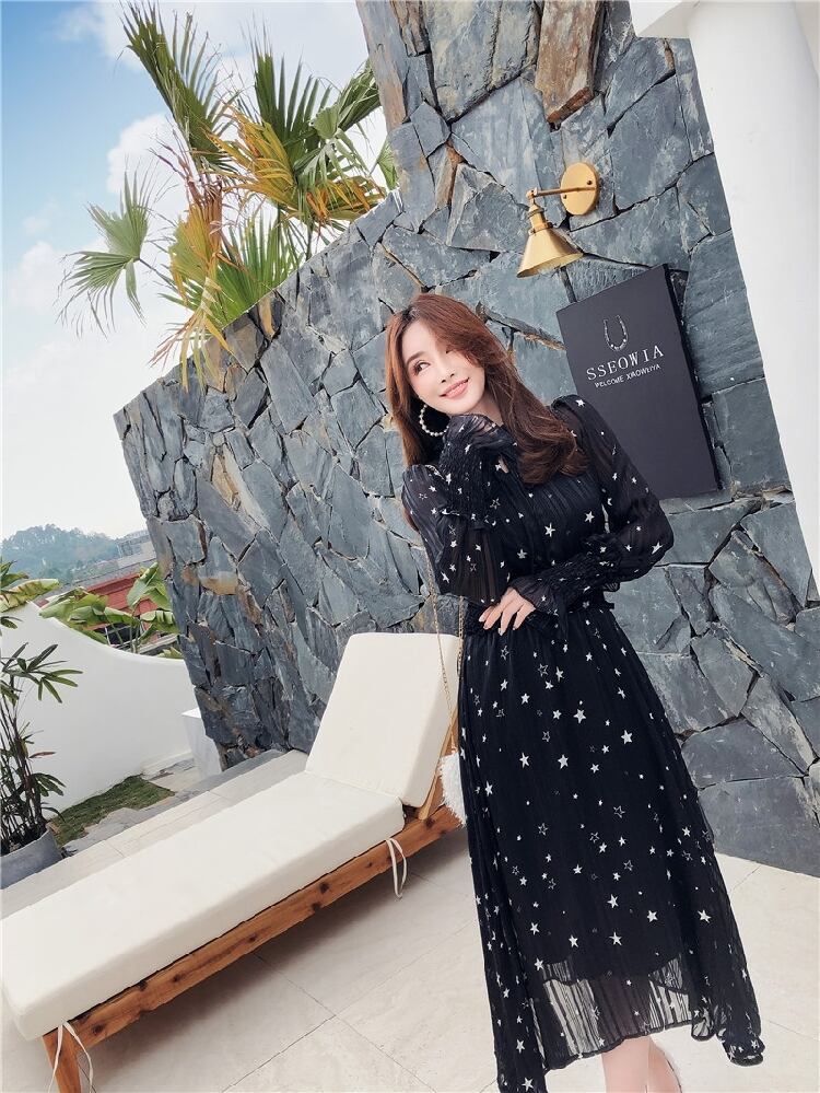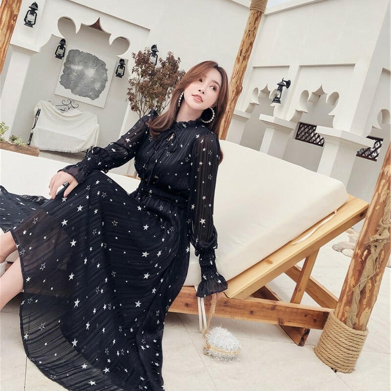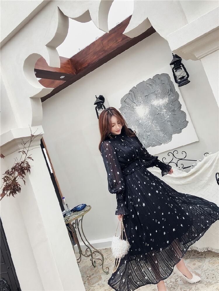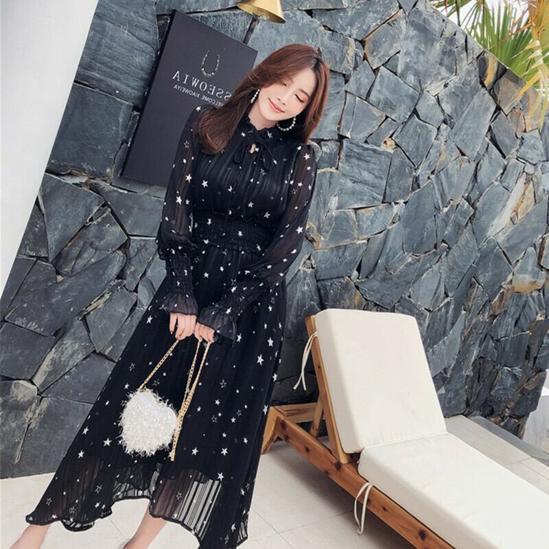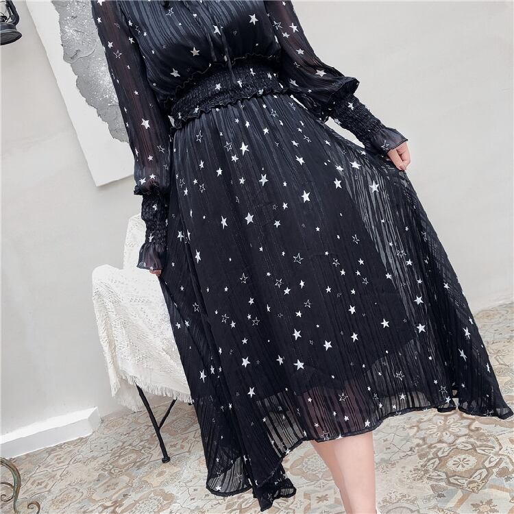 《入荷待ち》ワンピース 星柄 長袖 ロング丈 リボン ハイウエスト プリーツ ドレープ 透け感 大人可愛い