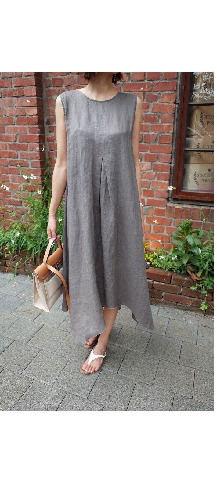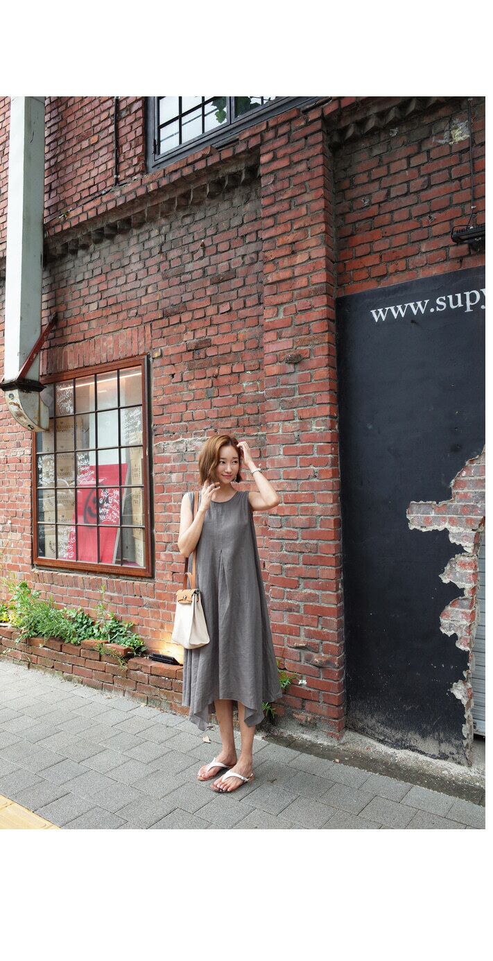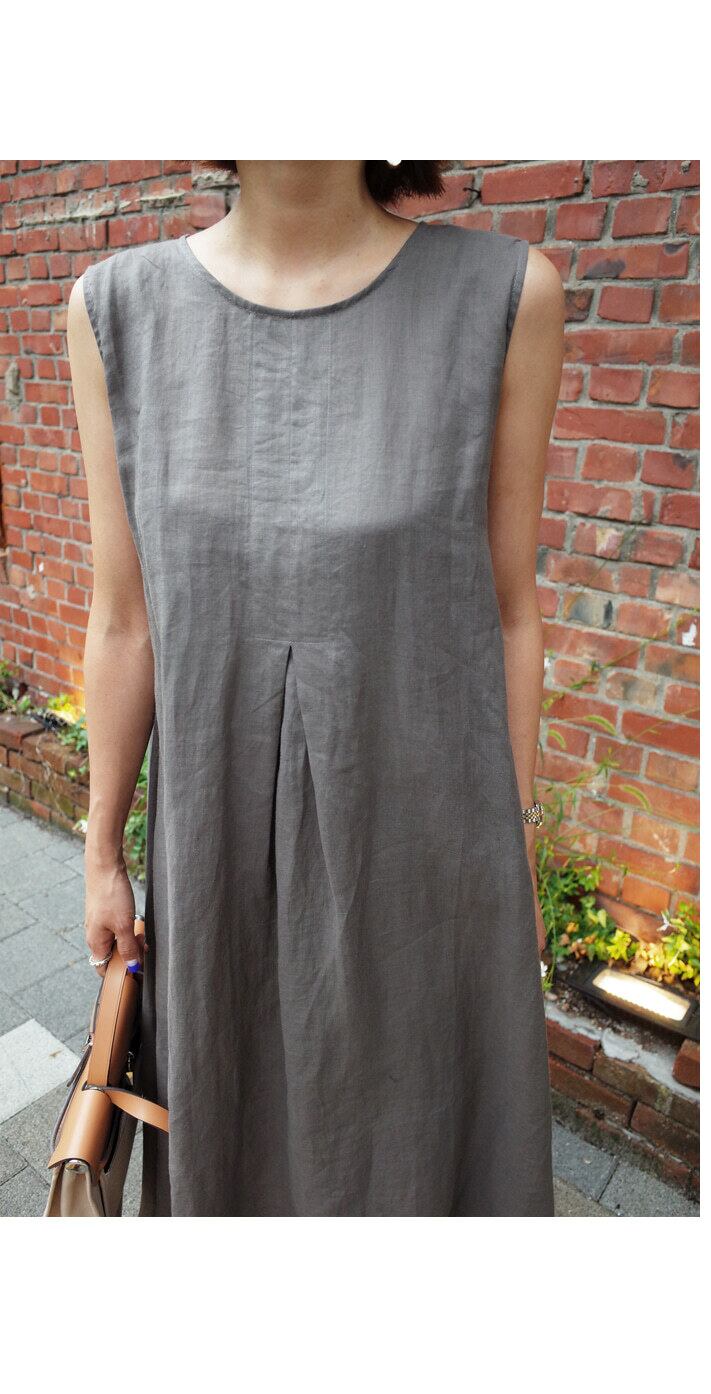 《入荷待ち》ゆったり ナチュラル シンプル ワンピース ノースリーブ ロング丈 ラウンドネック アシメントリー グレー