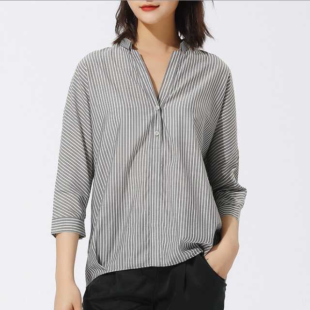 《入荷待ち》ストラスイプ Vネック シャツ 七分丈 グレー キレイめ ロングテール オフィス 通勤