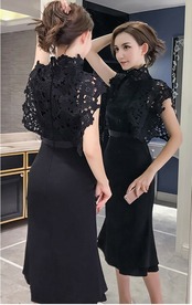 《入荷待ち》ドレス ドッキング 切り替え ハイウエスト レース ミディ丈 シンプル オケージョン セミフォーマル