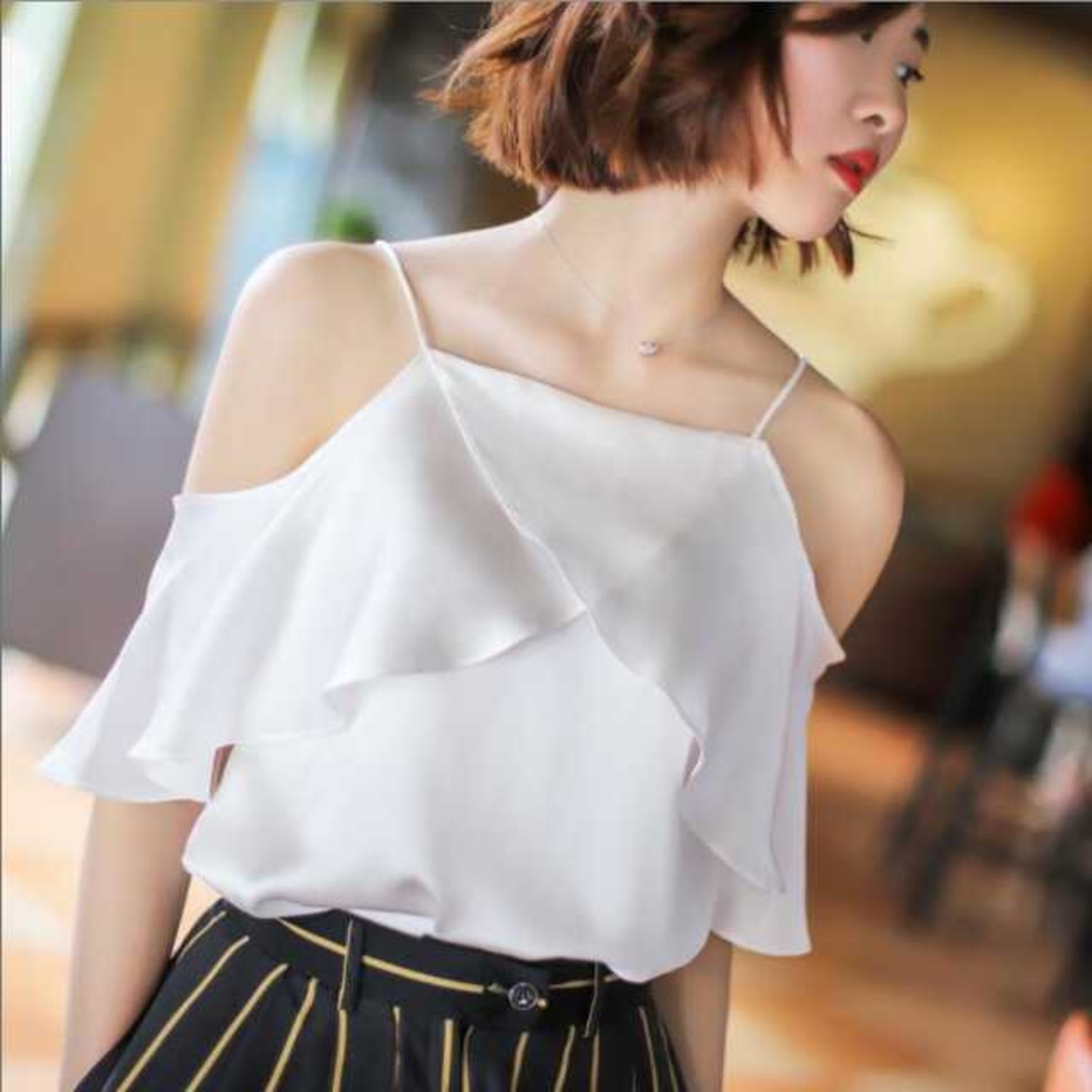 大胆オフショルトップスは細めのショルダーストラップで安心感を。