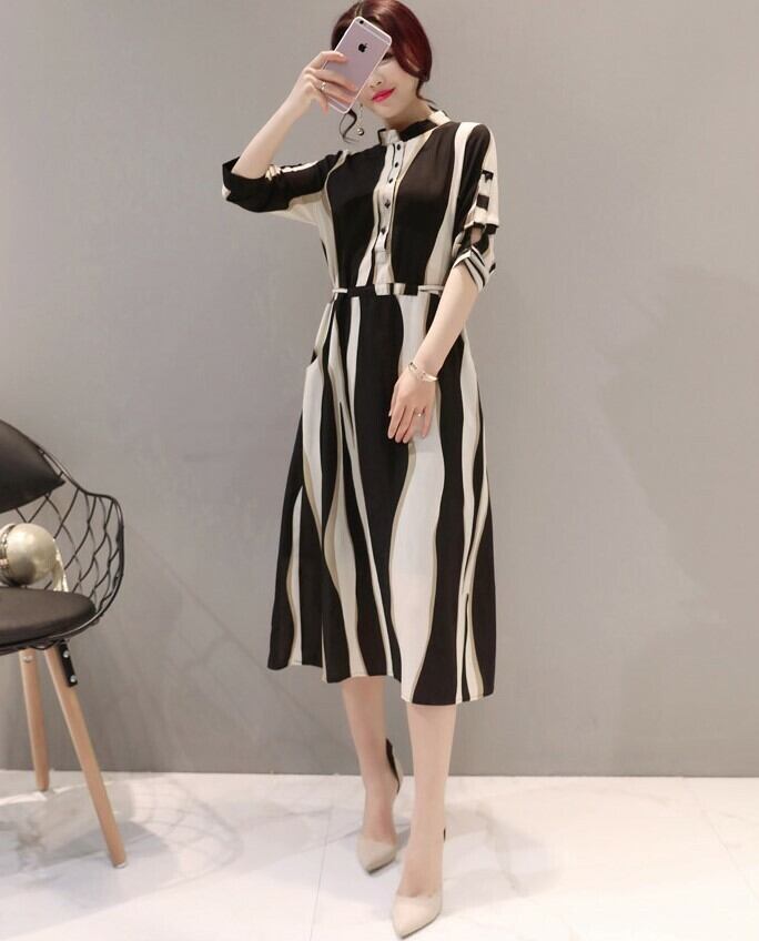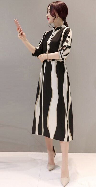《入荷待ち》ワンピース ハイウエスト ミディ丈 ミモレ丈 七分袖 リボン フロントボタン 大きいサイズ オケージョン