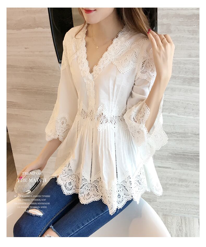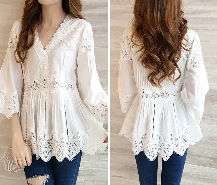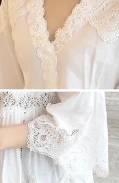 レースプルオーバー トップス 七分袖 ベルスリーブ Vネック 大きいサイズ フェミニン ホワイト