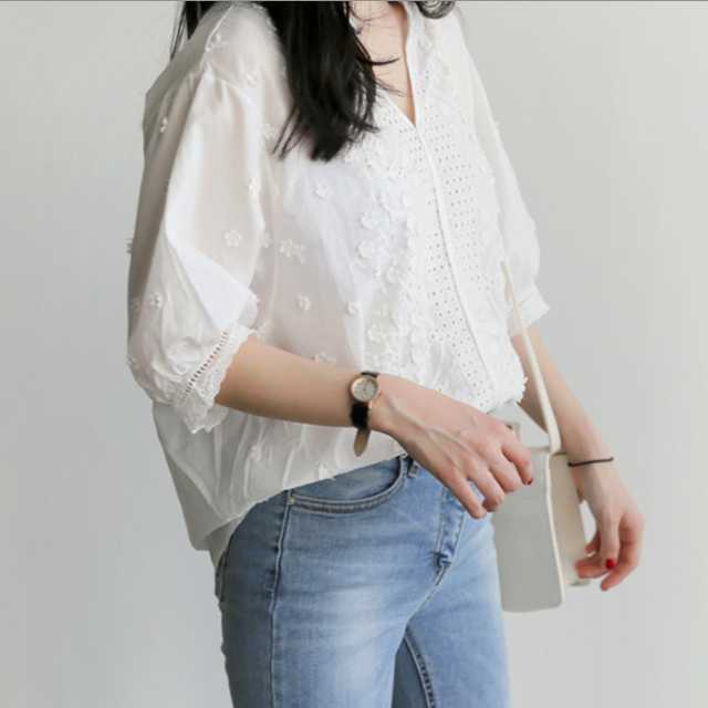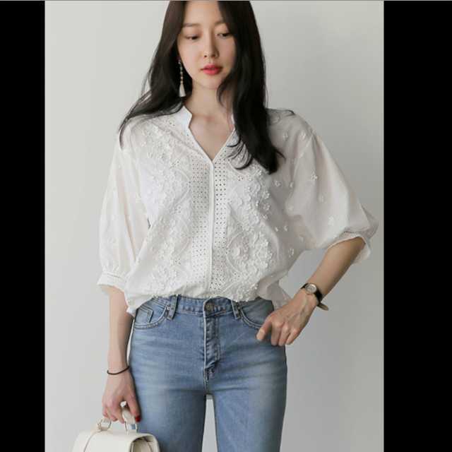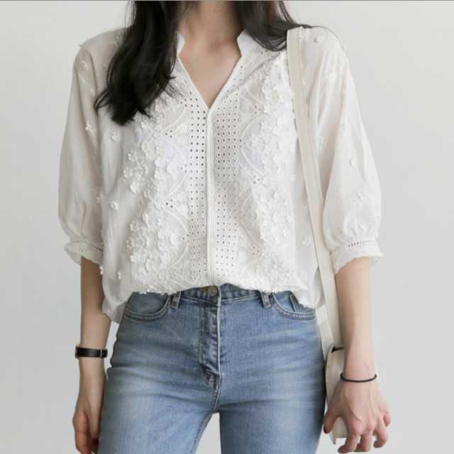 フェミニン 刺繍 ブラウス ホワイト シャツ 七分丈 ガーリー 大人可愛い レース パフスリーブ ロングテール
