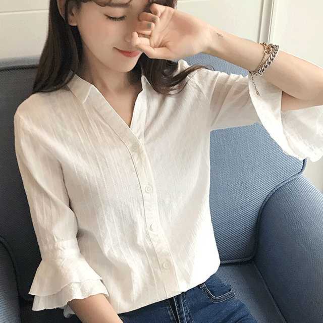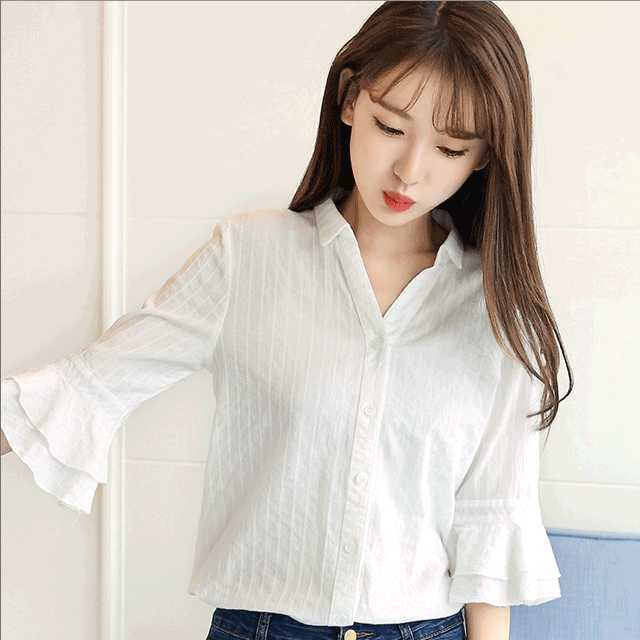 《再入荷》シンプル シャツ ブラウス 大人可愛い ベルスリーブ ティアードフリル ホワイト オフィスカジュアル キレイめ 通勤 ストライプ 七分丈