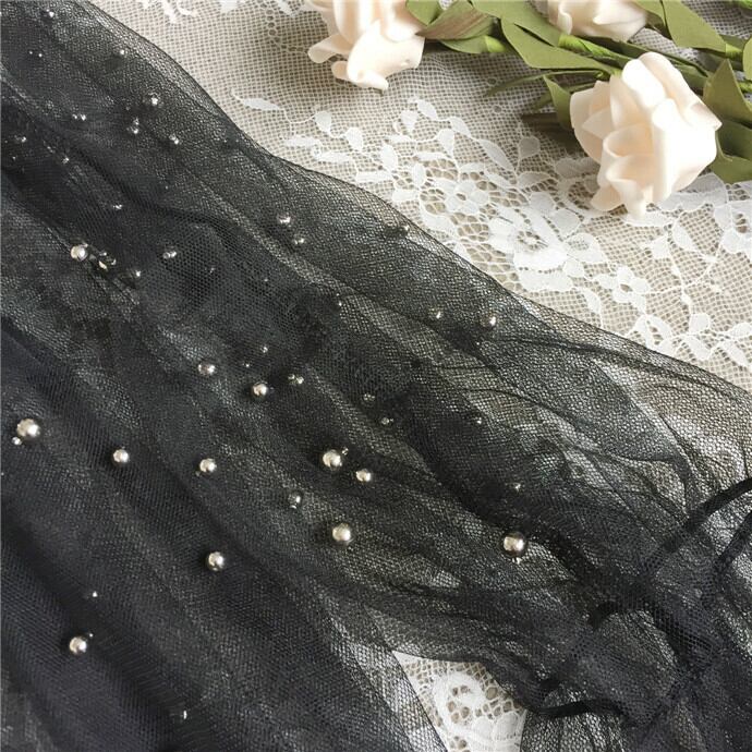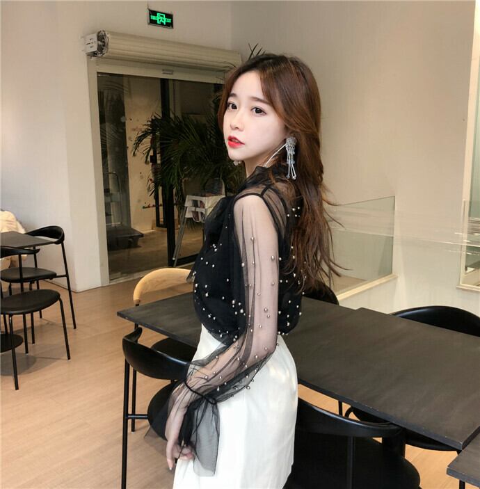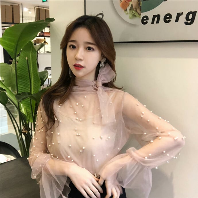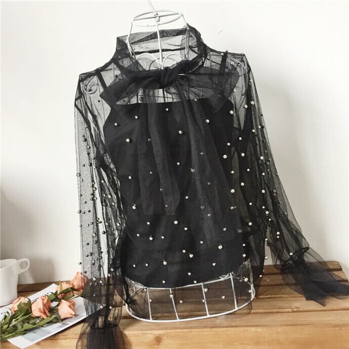 チュール透け感にパールの装飾がゴージャスなトップスは特別な日の1枚に。