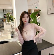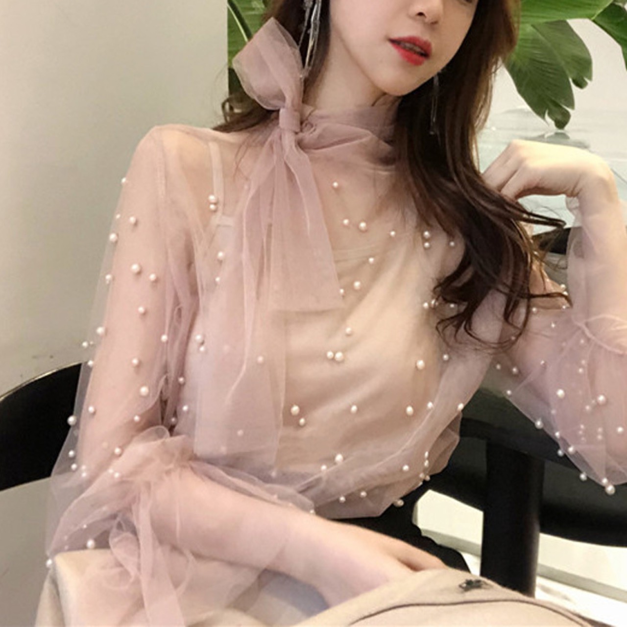 《入荷待ち》チュール トップス ブラウス パール お呼ばれ ディナー パーティー 女子会 透け感 リボン ベルスリーブ ピンク ブラック ツーピース