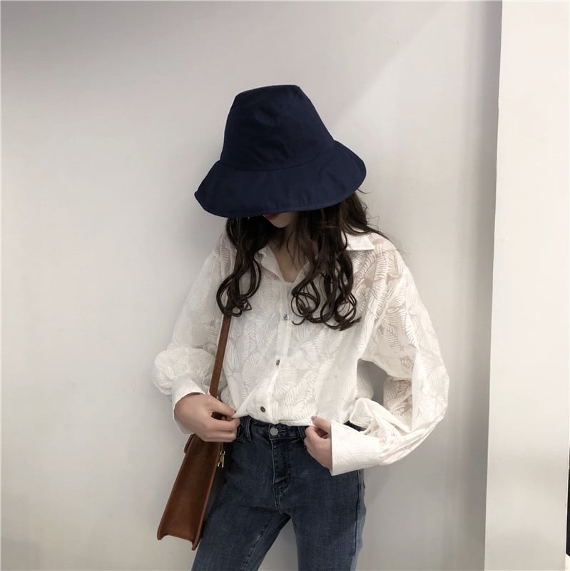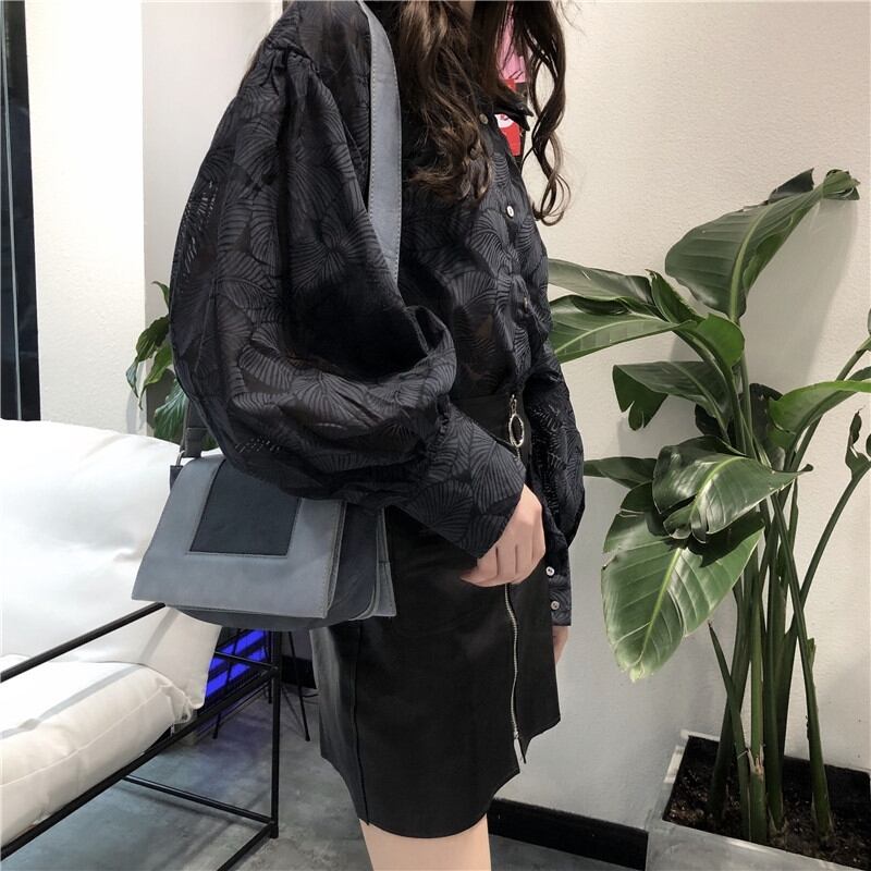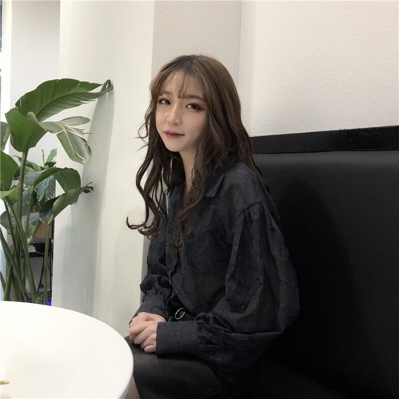 《入荷待ち》こなれ シャツ ブラウス 透け感 シースルー ホワイト ブラック 総柄 ボタニカル ランタンスリーブ バルーンスリーブ