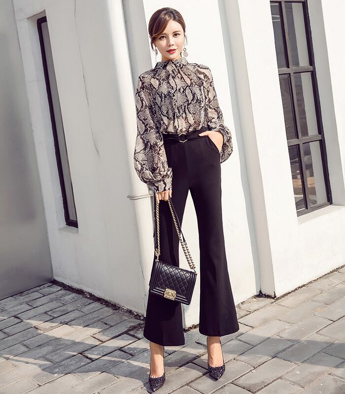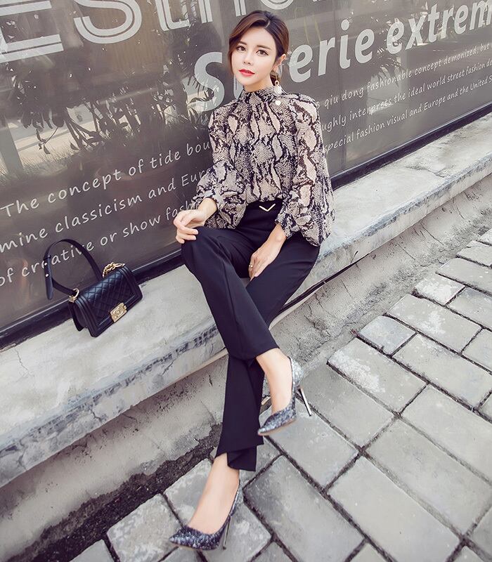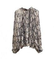ゴージャスなヘビ柄ブラウスはシフォン素材でふんわり、透け感がセクシー。