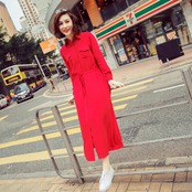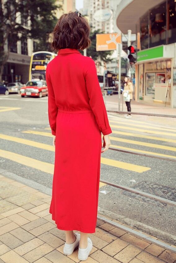 シャツワンピース 長袖 ドローストリング ハイウエスト ロング丈 ミモレ丈 無地 シンプル