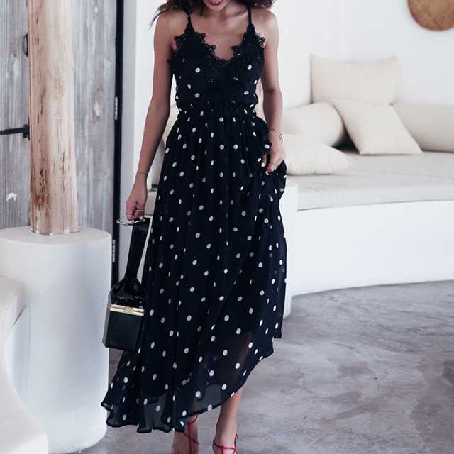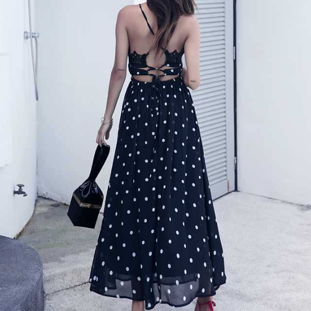 《入荷待ち》キャミソールワンピース ベアバック レースアップ レース ドット柄 ハイウエスト ロング丈 透け感 リゾート