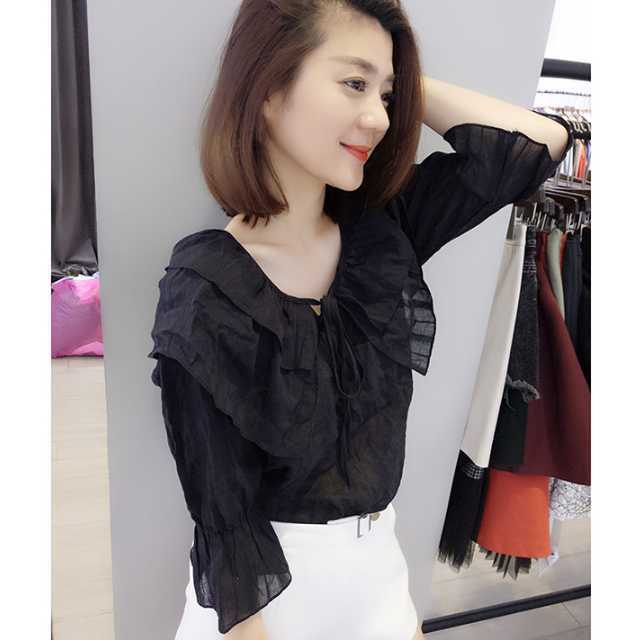 《入荷待ち》シフォンブラウス トップス カットソー Vネック フェミニン ガーリー 五分丈 フリル ティアード ブラック レッド