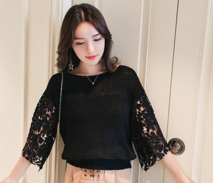 《入荷待ち》サマーニット トップス 総レース フェミニン ガーリー 大人可愛い ブラック 七分丈 ベルスリーブ