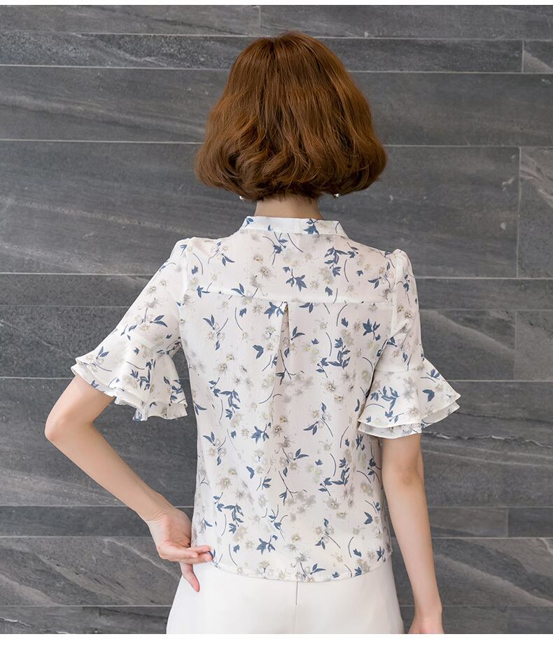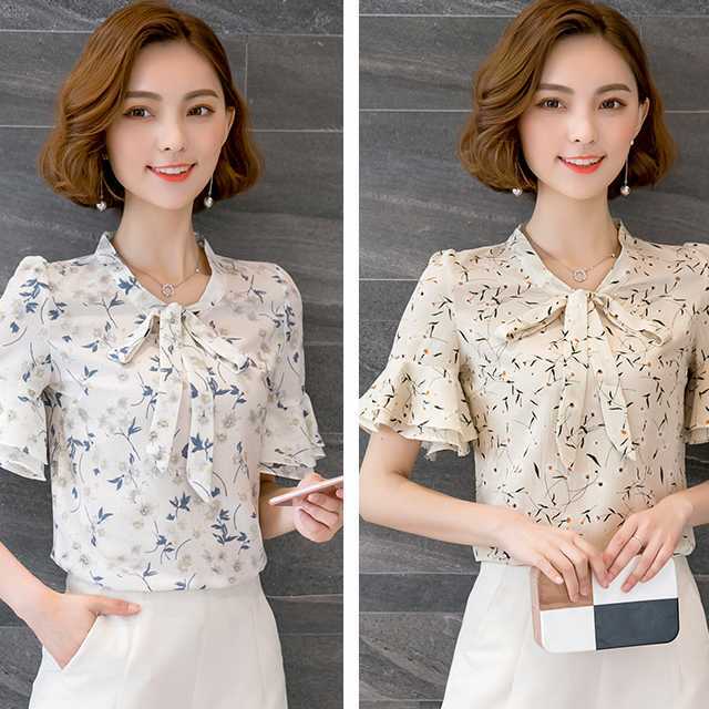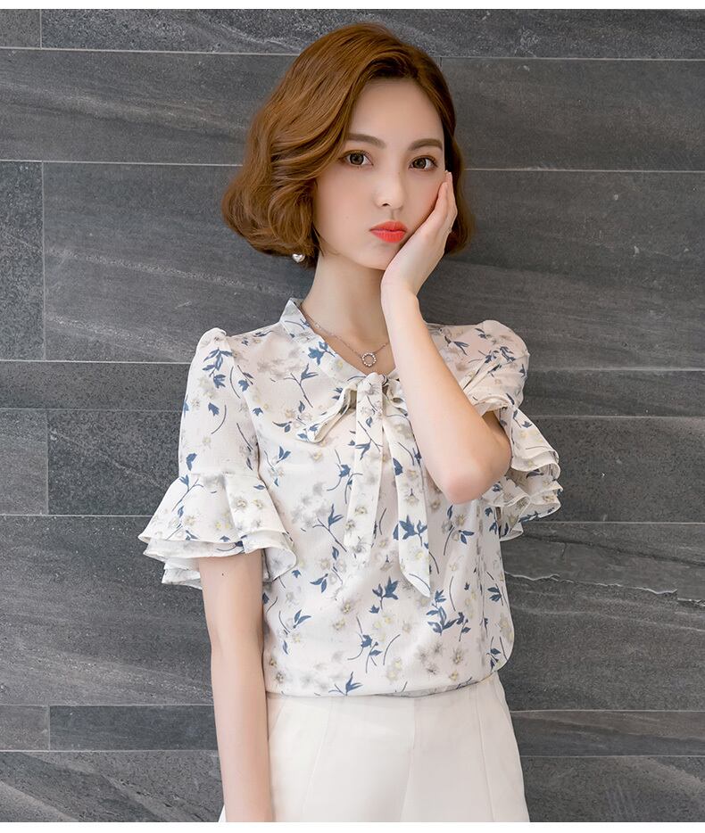 《入荷待ち》シフォン ブラウス 半袖 ティアード フリル リボン ボリューム袖 華奢見え ラウンドネック ガーリー フェミニン ホワイト イエロー 花柄