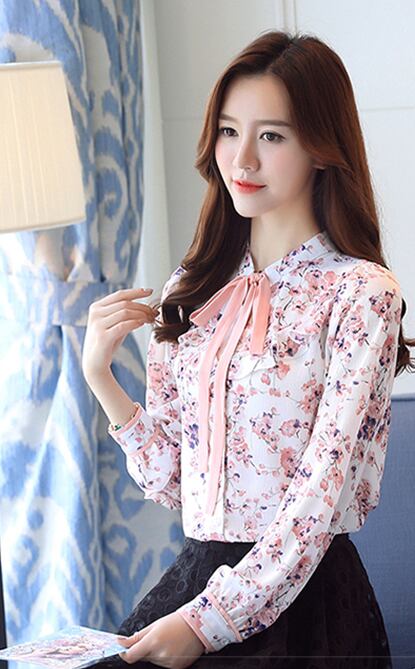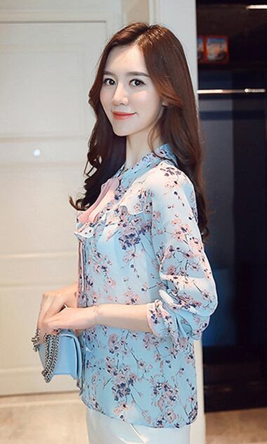 《入荷待ち》キュート シフォンブラウス 長袖 リボン ピンク ブルー 花柄 フラワー 総柄 ガーリー フェミニン デート お呼ばれ