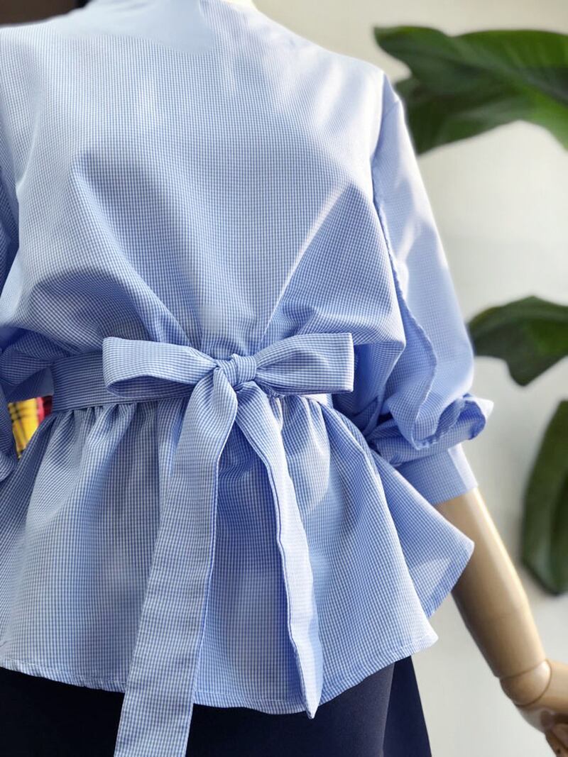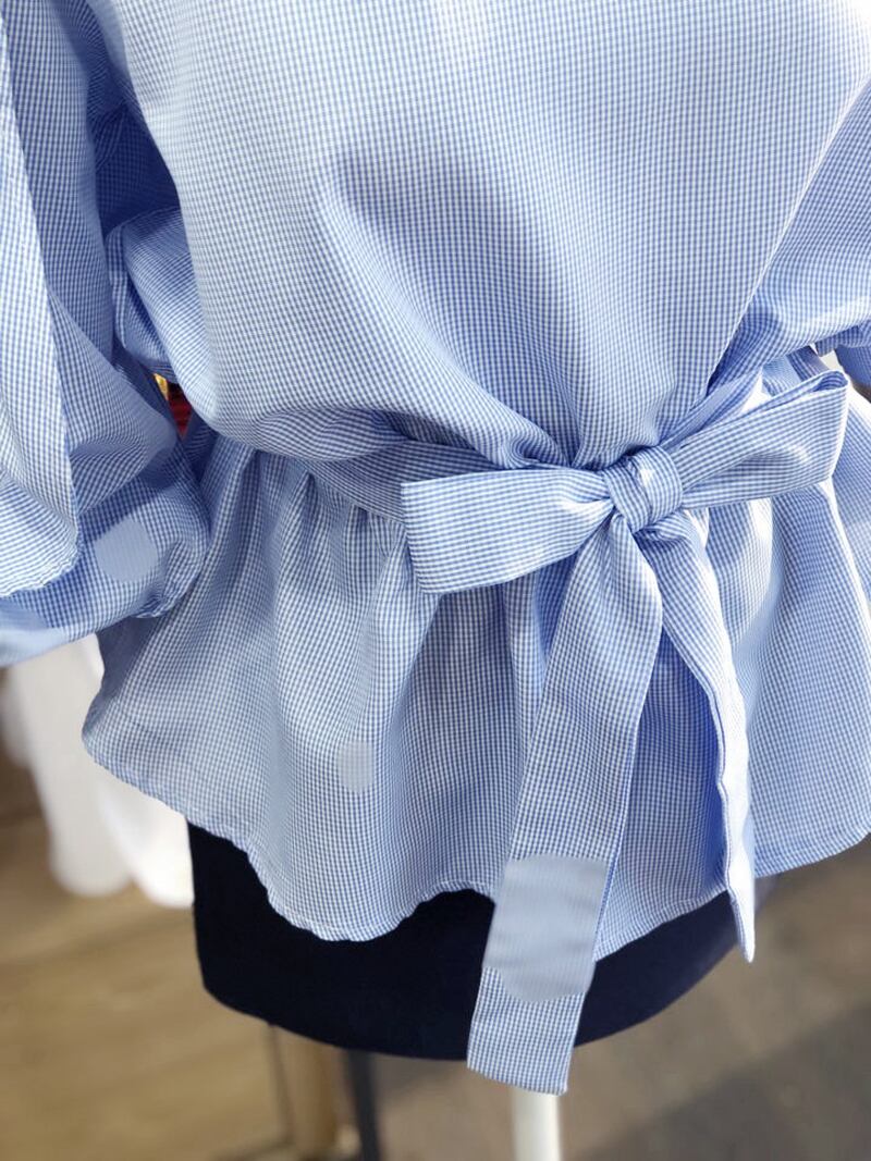 《入荷待ち》チェック チュニック リボン 七分袖 ブルー キレイめ 大人 女子会 デート