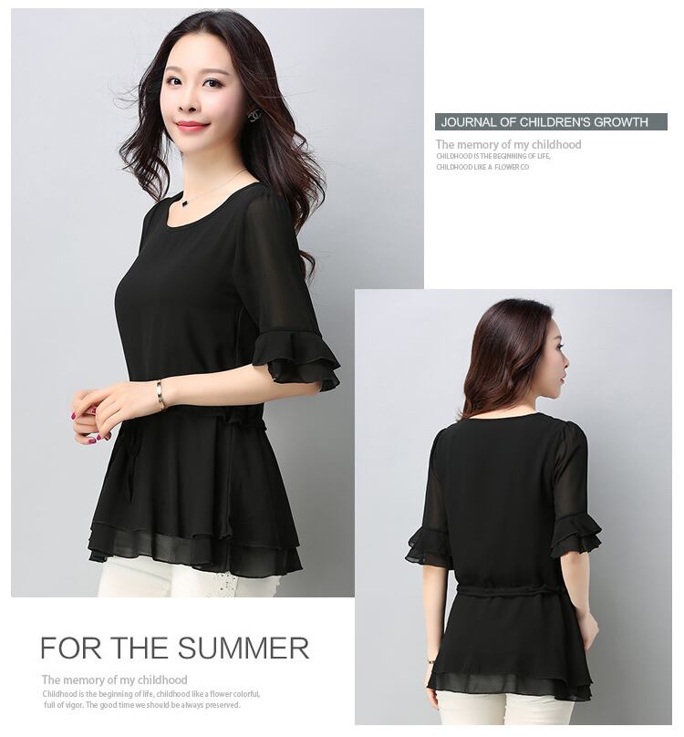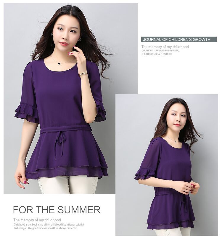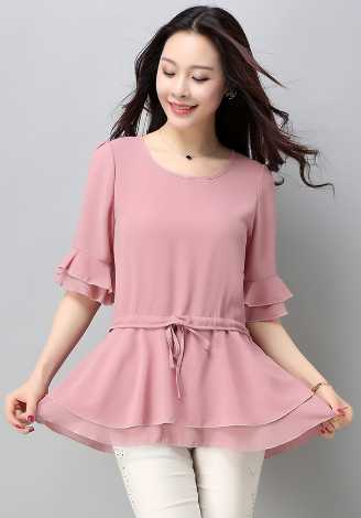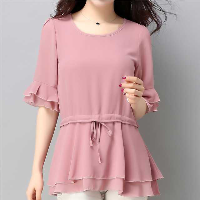 《入荷待ち》フェミニン フリル 五分袖 ウエスト リボン 大きいサイズ ピンク ブラック パープル デート 女子会 オフィス