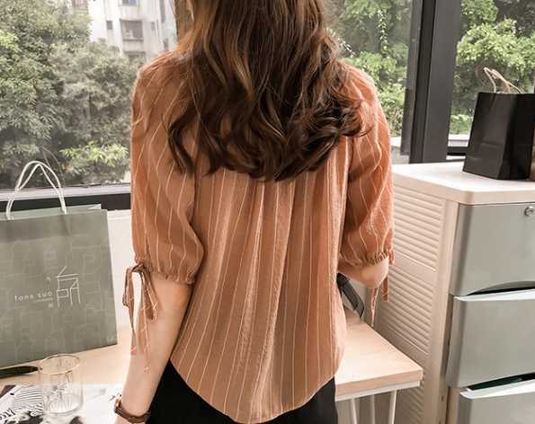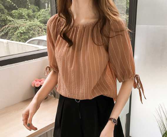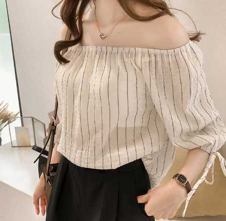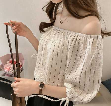 ストライプ チュニック リボン 五分袖 カジュアル 大きいサイズ オフィス シンプル オフショルダー ラウンドネック
