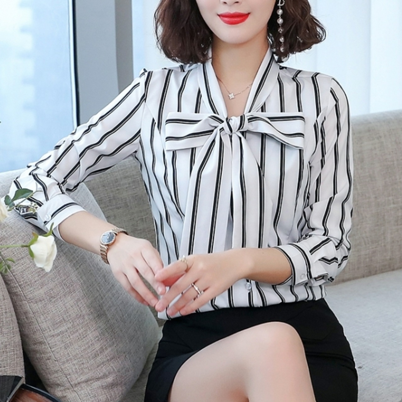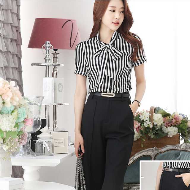 《再入荷》ストライプ シャツ ブラウス リボン モノトーン 大きいサイズ 半袖 女子会 デート オフィス