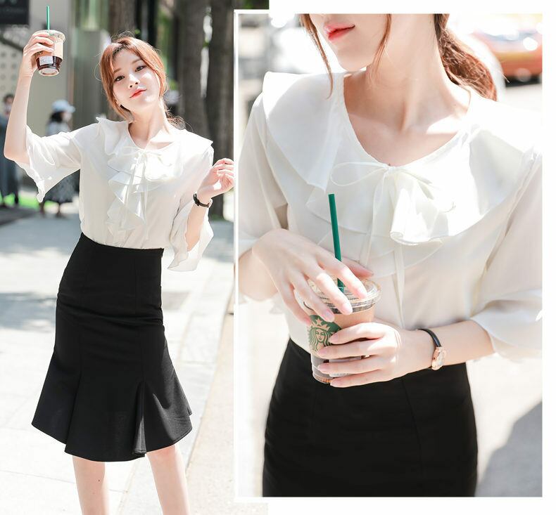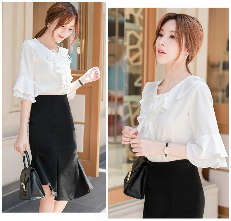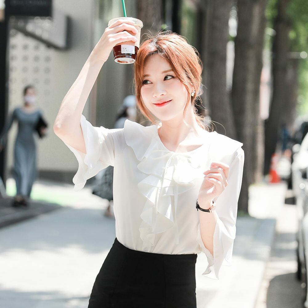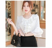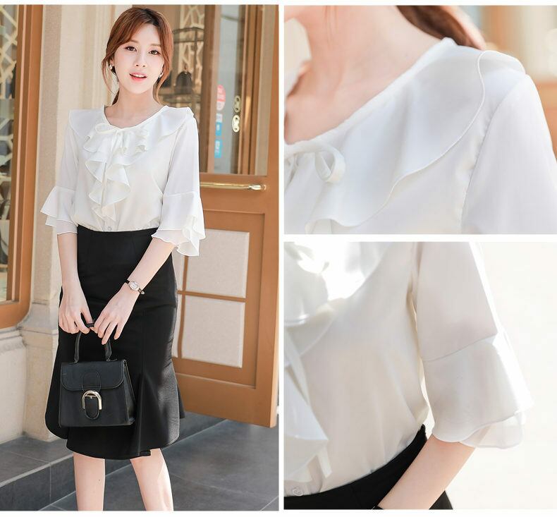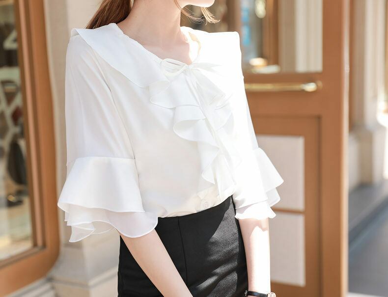 《入荷待ち》シフォン シャツ ブラウス フリル ベルスリーブ ホワイト 大きいサイズ デート 女子会 オフィス お呼ばれ ラウンドネック 七分丈