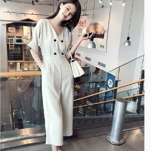 《入荷待ち》フロントボタン リネンジャンプスーツ ワイドレッグパンツスーツ ハイウエスト お出掛け 旅行 リゾート