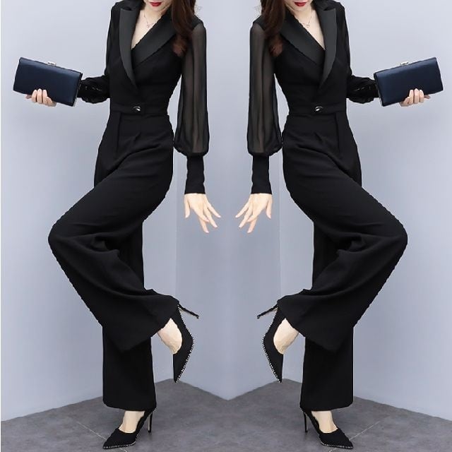 《再入荷》ワイドレッグ ジャンプスーツ ハイウエスト エレガント キレイめ パンツスーツ オールインワン シンプル ウエストマーク