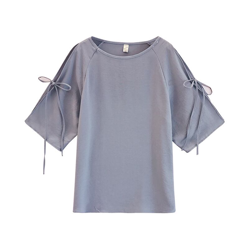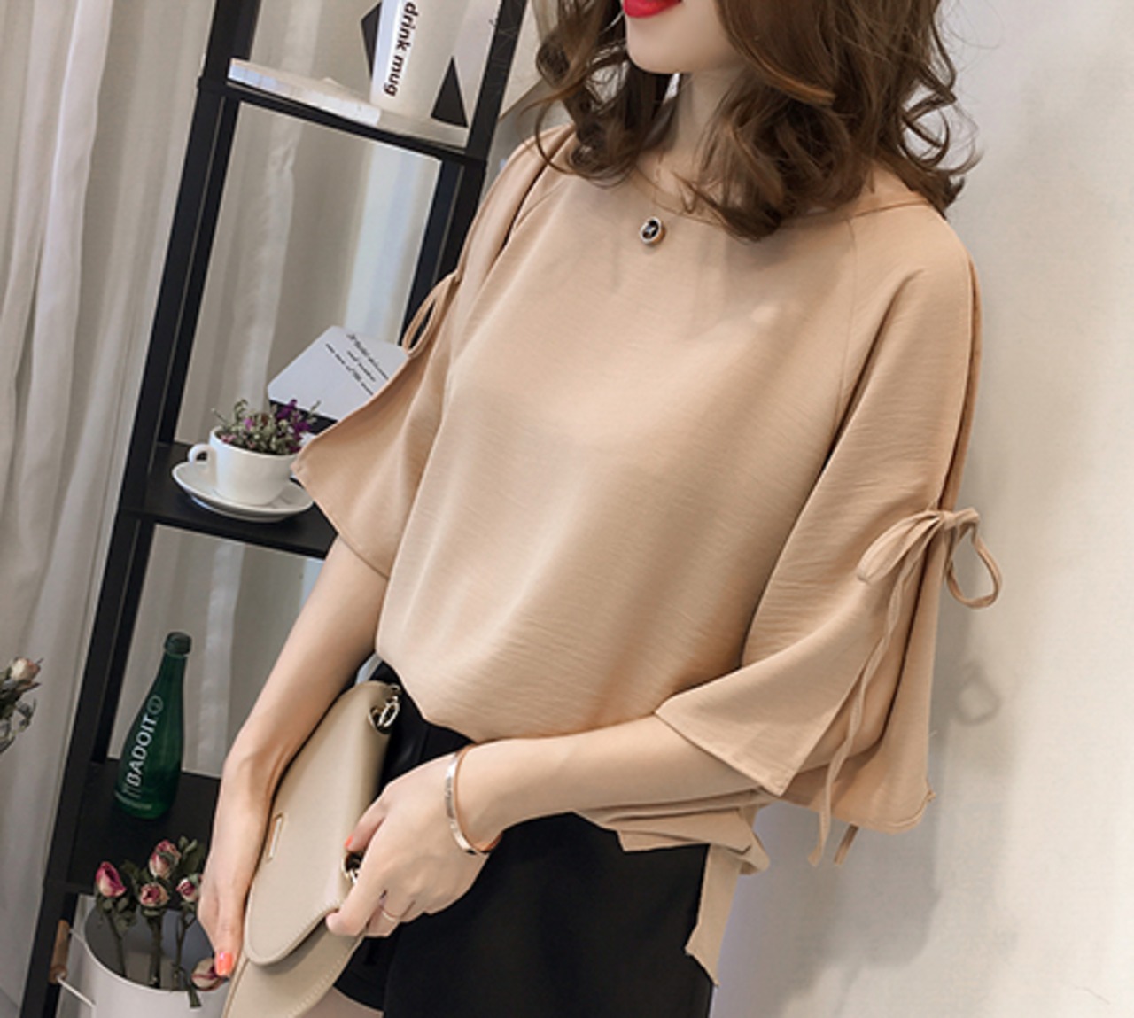 《入荷待ち》シフォン シャツ リボン ベルスリーブ フェミニン ベージュ ブルー 大きいサイズ 女子会 デート セクシー ショルダーカット