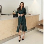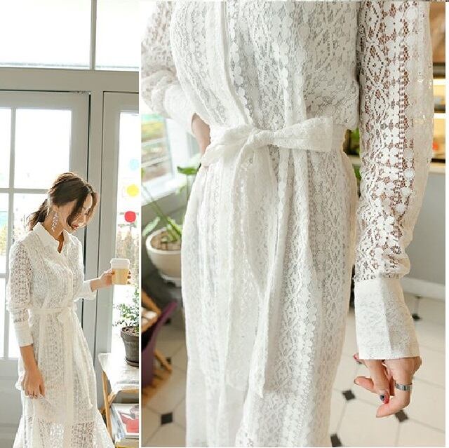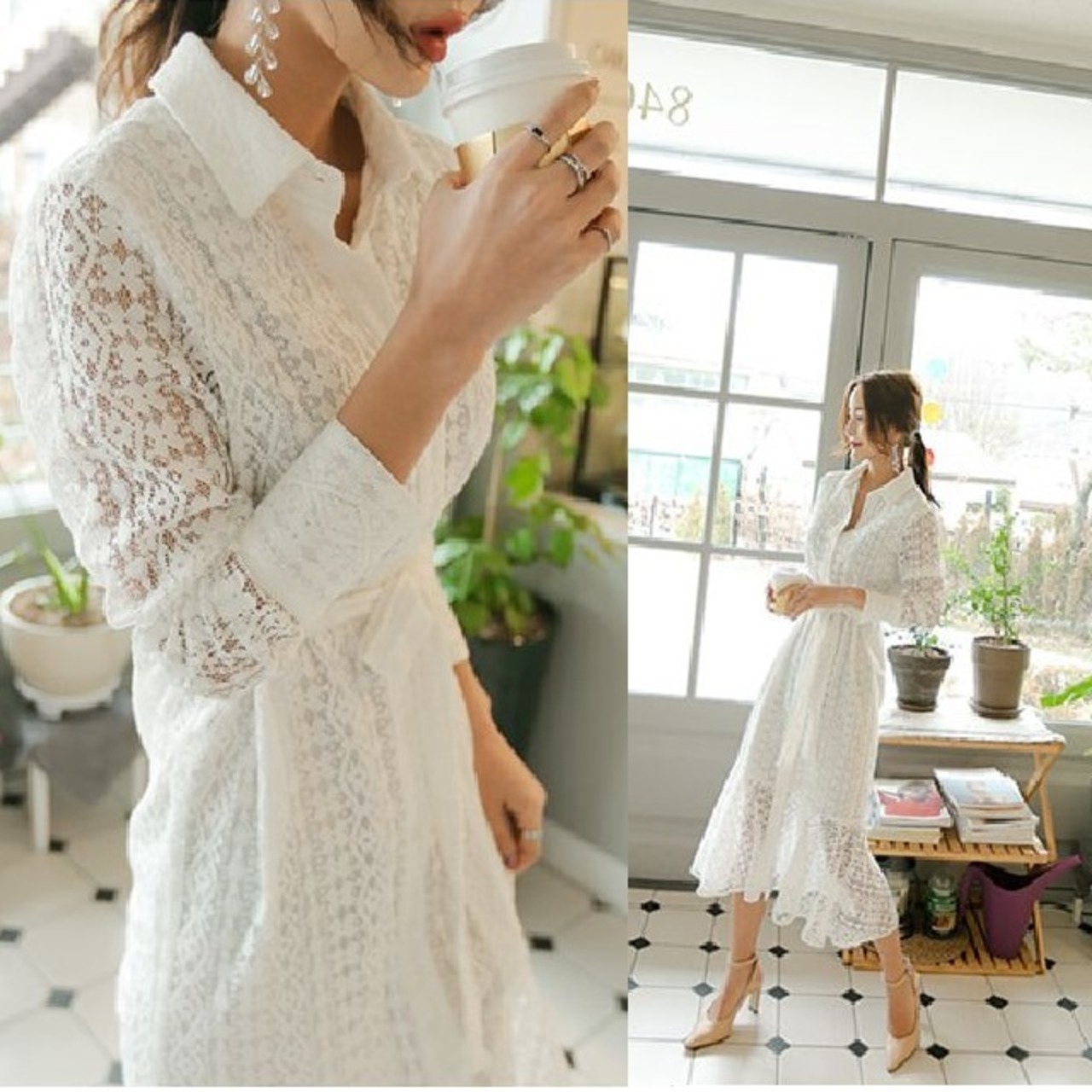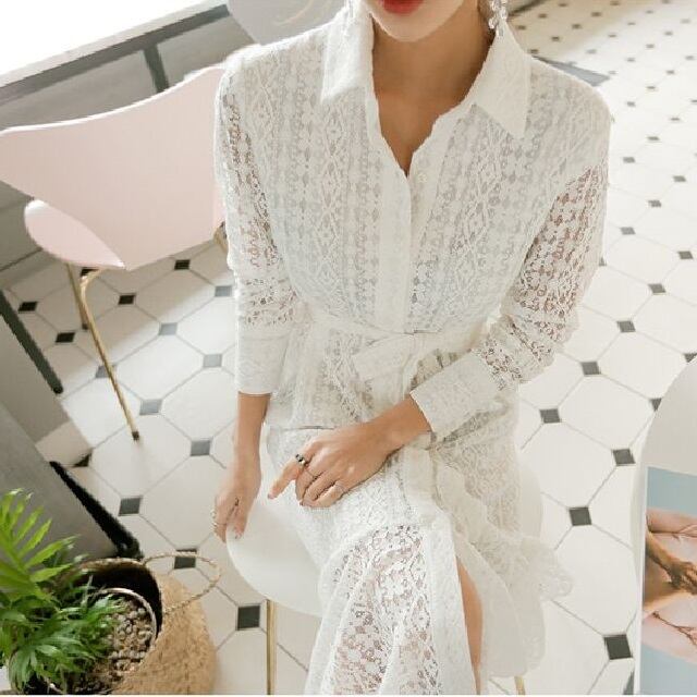 《再入荷》エレガント レース シャツドレス ワンピ ロング 膝丈 お出掛け 旅行 リゾート デート 長袖 透け感 シャツワンピース