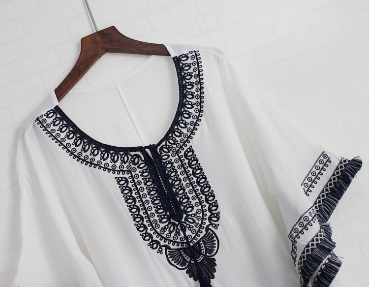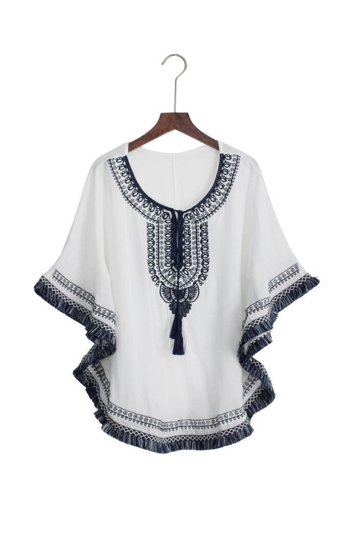 カジュアル トップス ポンチョ 夏 エスニック ホワイト ブラック フリンジ ラウンドネック