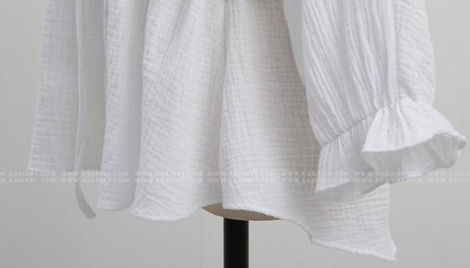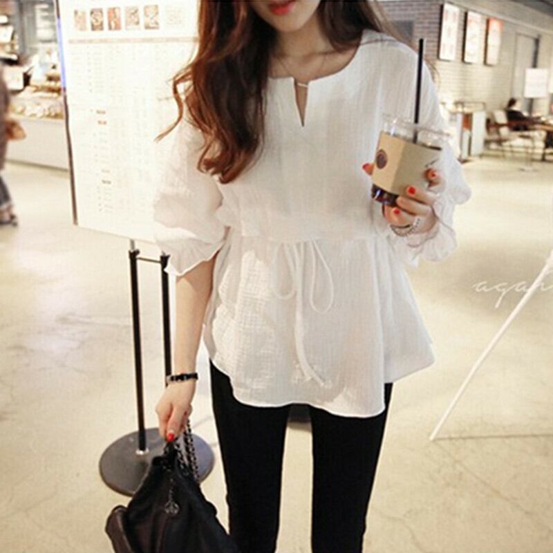 《再入荷》 ブラウス シャツ シンプル 七分丈 フリル バルーンスリーブ ラウンドネックチュニックリボン
