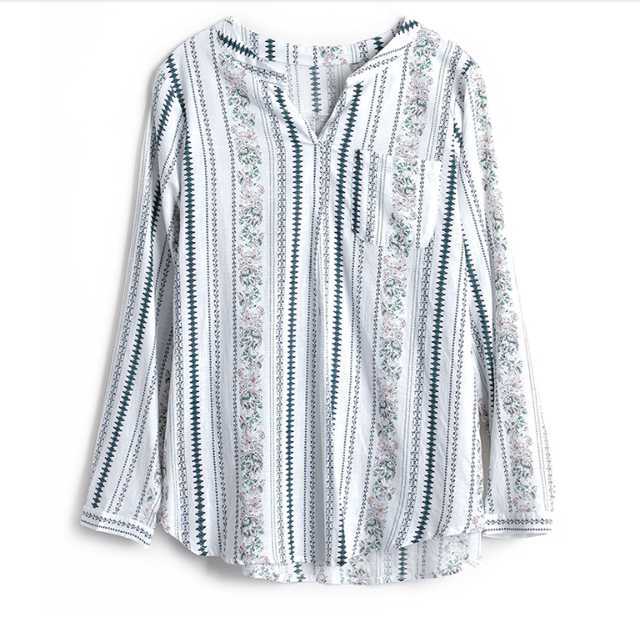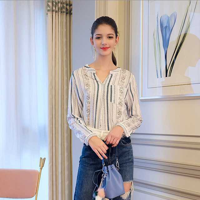 《入荷待ち》シャツ ブラウス Vネック 長袖 ストライプ 花柄 ホワイト フェミニン