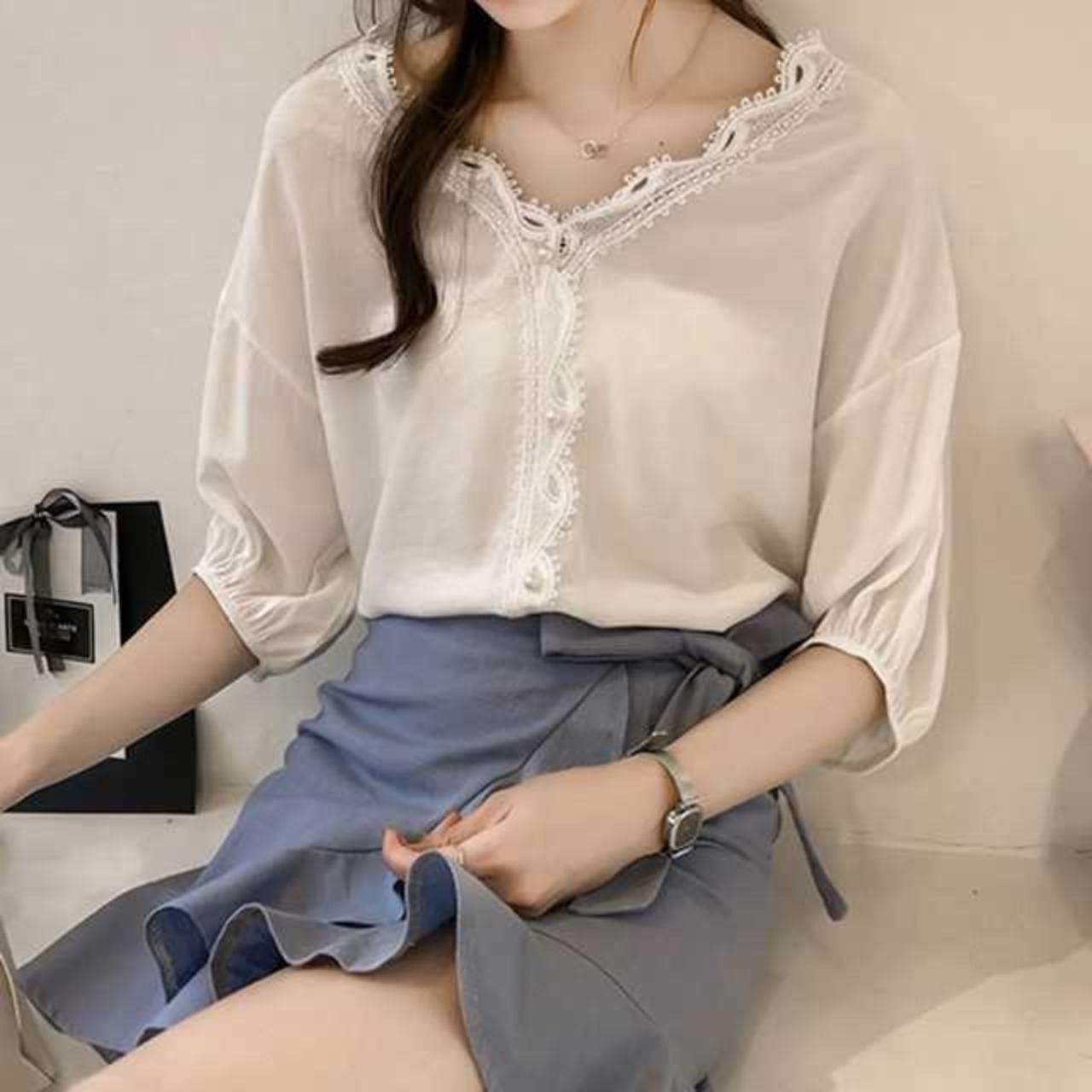 Vネックで首元はすっきりさせつつレース×パールで華やかな1枚に仕上げました♡