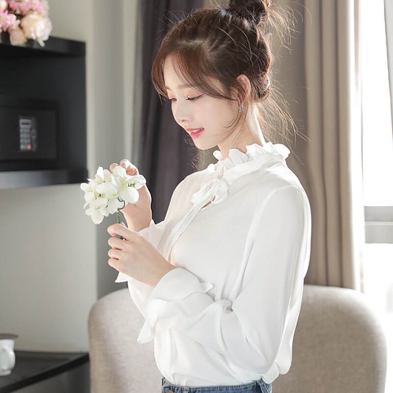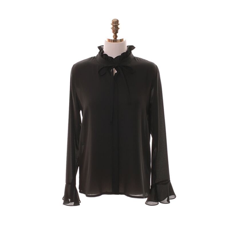 ブラウス シャツ ハイネック フリル リボン 長袖 ガーリー 大人可愛い デート 通勤 オフィス 大きいサイズ 小さいサイズ